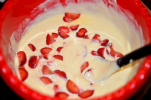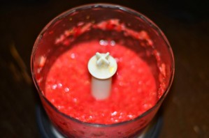 Половину клубники тем временем измельчаем в блендере. В стакане воды разводим желатин и добавляем его к клубнике.