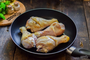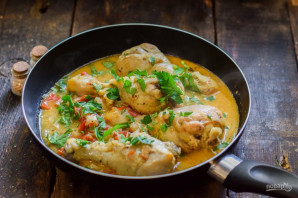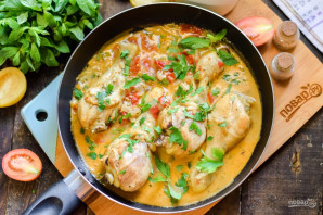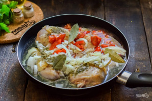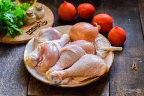 For this recipe, we'll use onion, garlic, and tomatoes. We'll simmer the chicken in a skillet with added water. The result will be very tender, delicious, and aromatic. You can use spices to your taste, but definitely add some khmeli-suneli.
