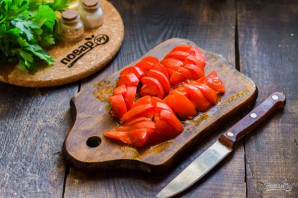 Rinse the tomatoes and dry them, then cut the tomatoes into small slices.