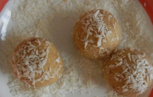 Roll the finished cookies in powdered sugar and coconut flakes.