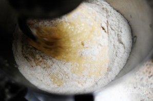 4. Соедините муку, соль и жидкую смесь в комбайне с помощью насадки-крюка или вручную. Замесите тесто.