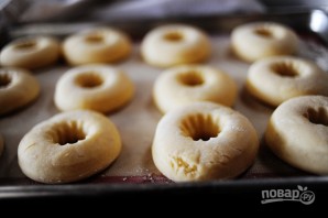 6. Вырежьте серединку в тесте и оставьте будущие пончики в теплом месте увеличиться в размере на один час.