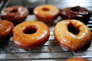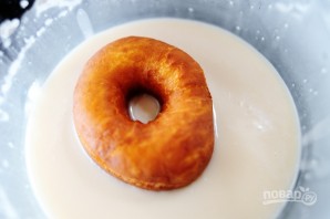 8. В пиале смешайте сахарную пудру, воду и ванилин. В полученную глазурь обмокните пончики.