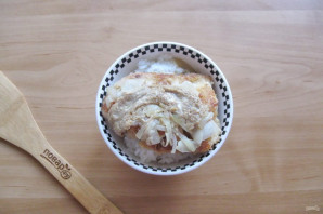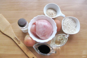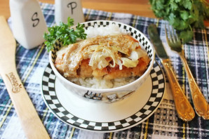 Place the chicken fillet with onion and the omelet with soy sauce into the bowl with boiled rice.