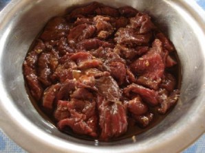 Pour the marinade over the beef and let it marinate for 30 minutes.
