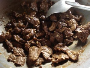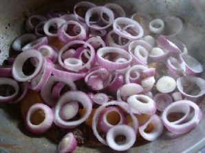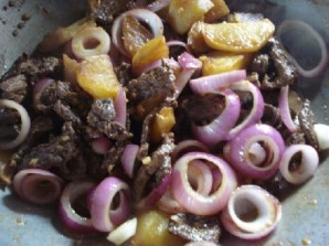 Pour a little marinade and some water into the beef. Cook until done. Then add potatoes and sliced onion rings.