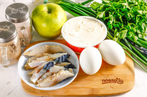 Подготовьте указанные ингредиенты. Куриные яйца отварите заранее и остудите в ледяной воде.