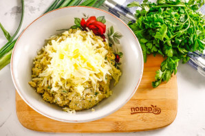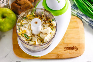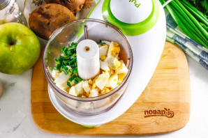 Куриные яйца очистите от скорлупы, промойте в воде и нарежьте мелким кубиком. Промойте и измельчите зеленый лук. Добавьте обе нарезки в чашу измельчителя либо прокрутите через мясорубку.