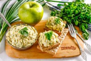 Выложите паштет из емкости в глубокую миску или тарелку. Очистите от кожуры зеленое яблоко, промойте и натрите на терке с мелкими ячейками прямо в паштет. Аккуратно все перемешайте. Попробуйте на вкус и при необходимости досолите.