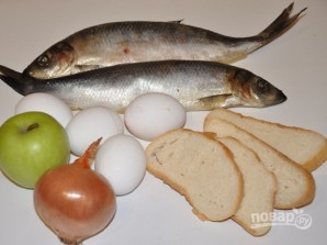 Вот все ингредиенты, которые нам понадобятся. Если яблоко у вас некислое, потребуется винный уксус. Кусочки хлеба замочим в воде.