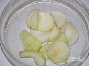 Яблоко очистим от кожуры и сердцевины, очистим лук. Нарежем дольками.