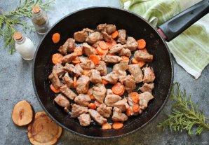 В сковороду налейте растительное масло, выложите морковь порезанную кружочками. Филе индейки порежьте на кусочки и добавьте в сковороду. Обжаривайте все на среднем огне в течение 10-15 минут.
