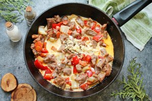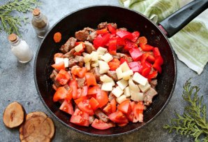 Порежьте на кусочки помидор, сельдерей и болгарский перец. Все посолите, поперчите и перемешайте, обжаривайте все в течение трех минут.