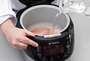 Place the chicken fillet in the multicooker bowl and pour in water (1 liter). Set the "Multicook" mode, set the temperature to 140 degrees, and cook the meat for 10 minutes. After the time is up, once the fillet has cooled slightly, remove it and cut into pieces.