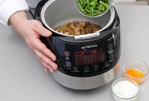 Set the fillet aside for now, and place the dried mushrooms and green beans into the multicooker. Cook for 4-5 minutes in the same mode, then carefully remove the mushrooms and beans using a slotted spoon and transfer them to a plate. Pour the broth into a deep container and mix it with the egg yolk and sour cream, then season with salt and pepper.