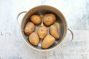 Картофель вымойте и отварите в мундире до готовности. Снимите с огня, залейте холодной водой и слейте ее.