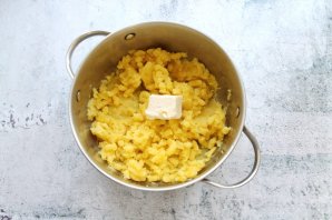 Картофель очистите от кожуры, помните и добавьте 40 грамм сливочного масла, перемешайте.