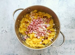 Ветчину порежьте мелким кубиком и добавьте в картофельное пюре.