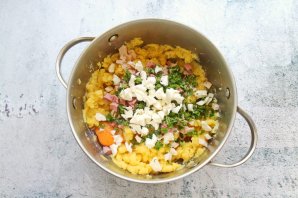 Зелень и моцареллу мелко порежьте и выложите в пюре. Все посолите, разбейте яйцо, добавьте желток и перемешайте.