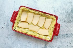 Форму для запекания смажьте растительным маслом и посыпьте панировочными сухарями. Выложите половину картофельной массы и разровняйте, сделав бортики. Твердый сыр порежьте на пластинки и выложите на картофель.