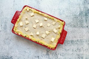 Сверху выложите оставшееся картофельное пюре, разровняйте, посыпьте оставшимися панировочными сухарями и нарежьте оставшееся сливочное масло.
