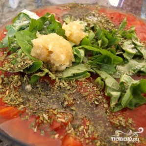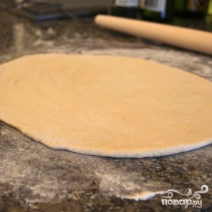Нагреть духовку до 220 градусов. На хорошо присыпанной мукой поверхности стола, раскатать тесто в большой тонкий круг. Выложить корж на лист для выпечки или противень, запекать в течении 5 минут.