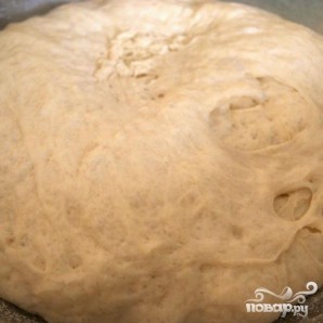 В большой миске смешать дрожжевой раствор, муку, топленое сливочное масло, соль и чесночный порошок. Месить тесто до хорошей гладкой текстуры. Если же тесто получилось слишком липким добавьте еще немного муки. Далее нужно придать тесту форму шара, поместить в миску и накрыть крышкой или пленкой, затем убрать миску в теплое место на 1 час подняться.