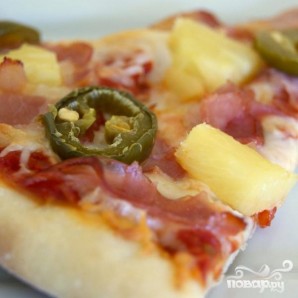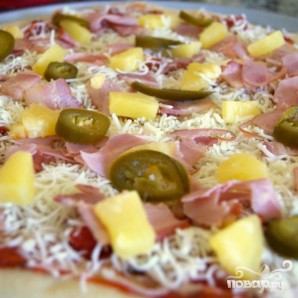 Разлить 1 чашку соуса по коржу, добавить сыр. Выложить на основу ветчину, бекон, кусочки ананаса и перца халапеньо.