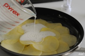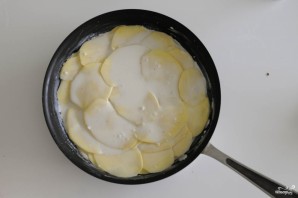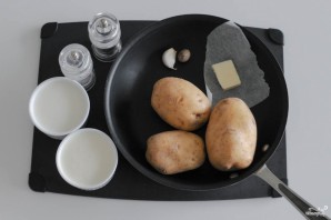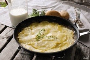 The recipe won't take much time. To make the potato gratin tender, even creamy in texture, we'll mix cream with milk. Use cream with a higher fat content. The dish turns out quite caloric, but filling. In addition to nutmeg, you can confidently add rosemary or other herbs to the gratin. Serve hot.