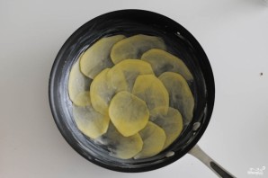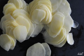 Peel the potatoes and slice them into thin rounds. A vegetable slicer is very convenient for this.