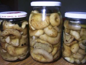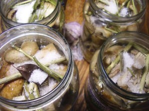 Складываем грибы в стерилизованные баночки, предварительно поместив на дно чеснок, хрен, перец, гвоздику. Сверху выкладываем укроп, листья смородины и вишни, столовую ложку соли. Заливаем грибы маринадом и закрываем. Через 2 недели можно есть!