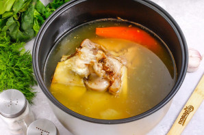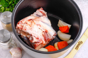 Set the appliance to the "Cooking" or "Aspic" mode for 4 hours. Remember that the appliance will heat the water for only 30-40 minutes! After boiling, be sure to remove the foam that forms to prevent the broth from becoming cloudy. Add peeled garlic cloves to the pot 15 minutes before the end of cooking.