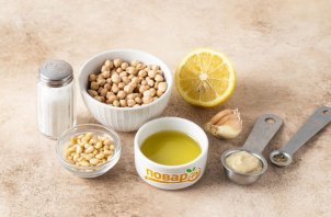 Переложите нут в чашу для измельчения. Добавьте пару очищенных и нарезанных зубчиков чеснока, лимонный сок и тахини.