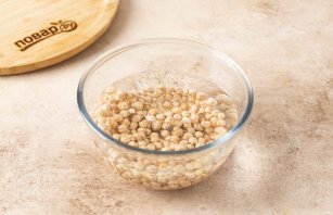 Нут замочите на 7-8 часов. Затем промойте и откиньте на сито.