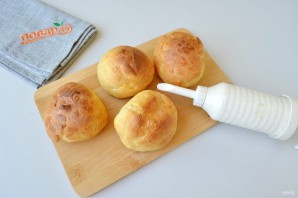 10. Творожной начинкой наполните кулинарный шприц или мешок, поставьте насадку "носик". Прокалывайте пирожные снизу или сбоку и наполняйте кремом.
