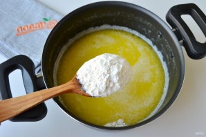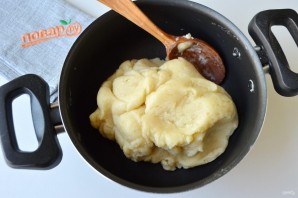 3. В кипящую смесь положите муку, быстро перемешивайте минутку-две, снимите с огня. Доведите тесто до однородного состояния.