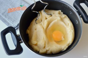 5. Приготовьте миксер с насадками для теста "крюк". В остывшее тесто вбивайте по одному яйца и тщательно миксером вымешивайте тесто. Не добавляйте следующее яйцо, пока предыдущее не будет полностью вмешано.