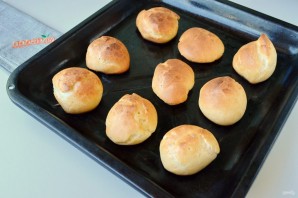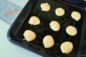 7. Чайными ложками выкладывайте тесто на смазанный противень и выпекайте в горячей духовке (200 градусов) по 15 минут каждую партию. Потом снизьте температуру до 160 градусов и подержите еще минут 10-15 в духовке. Не забывайте делать небольшие расстояния, пирожные растут!