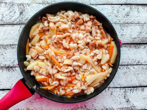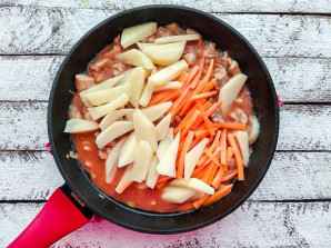 Add the potatoes and carrots to the chicken, pour in a little water, mix, and simmer over low heat with the lid closed for 20-25 minutes.
