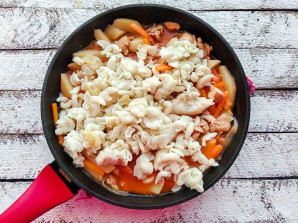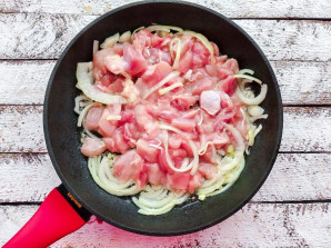 Heat the pan well, add vegetable oil, add the chicken with onion, and fry for 5-10 minutes.