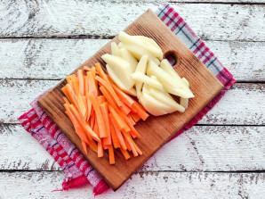 Wash the vegetables well, peel, and cut into strips.