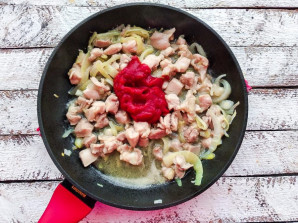 Add tomato paste to the fried chicken with onions, mix well, and simmer for 3-4 minutes.