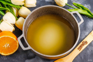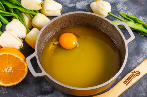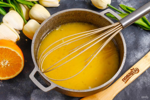 Апельсиновый сок перелейте в казан или ковш с антипригарным покрытием. Всыпьте туда же сахарный песок.