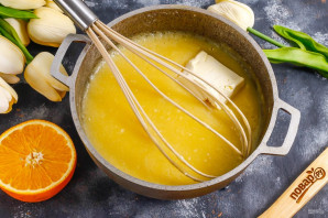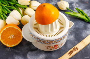 В это время сварите апельсиновый курд. Разрежьте один из апельсинов пополам, из половины и второго апельсина выжмите сок. Половину фрукта оставьте для украшения.