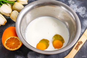 В глубокую емкость влейте молоко любой жирности и вбейте куриные яйца. Всыпьте соль и сахарный песок. Соль добавляйте обязательно! Взбейте все венчиком.