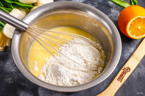 Влейте в емкость растопленное сливочное масло. Всыпьте муку и разрыхлитель, ванильный сахар. Аккуратно вмешайте сухие составляющие в жидкие, стараясь не создавать комочков. Разогрейте духовку до 180 градусов.