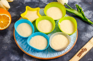Выложите тесто в силиконовые или металлические формочки для кексов, заполняя чуть больше середины каждой формы, но не более, так как выпечка вырастет в размерах. Поместите формы в духовку.