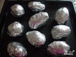 1. Select smooth potatoes, preferably of the same size. Wash them thoroughly to remove all dirt. Brush each potato with vegetable oil. Cut the foil to the size of the potatoes. Wrap each potato individually in foil.