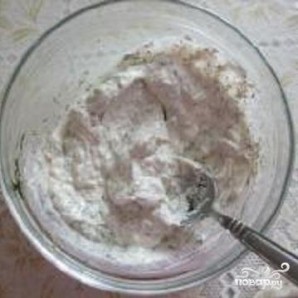 3. There is time to prepare the sauce. In a separate container, mix sour cream and mayonnaise. Mince the garlic using a garlic press. Finely chop the pickled cucumber. Wash the herbs, dry them, and chop finely. Add the cucumbers, garlic, and herbs to the sour cream-mayonnaise mixture.