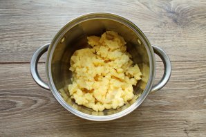 Картофель почистите и отварите в соленой воде до готовности. На это уйдет примерно 25-30 минут, в зависимости от величины клубней. Снимите с огня и тщательно слейте отвар. Превратите картофель при помощи толкушки в однородное пюре и остудите.